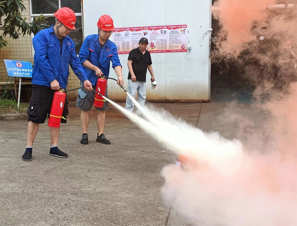 本次演練以“突發(fā)多點(diǎn)火情”為背景,設(shè)定辦公區(qū)域與總裝車間2處區(qū)域同時(shí)出現(xiàn)險(xiǎn)情,公司安全管理員李建明負(fù)責(zé)策劃準(zhǔn)備工作。14時(shí)01分,安全警戒組釋放煙霧彈模擬火場濃煙,同時(shí)觸發(fā)報(bào)警器,刺耳的哨聲與“著火啦!快撤離!”的呼救聲瞬間響徹廠房。后勤組同步切斷電源,通訊組緊急上報(bào)總指揮并模擬撥打119救援,100余名員工在疏散組指引下彎腰捂鼻,沿安全通道快速撤離。