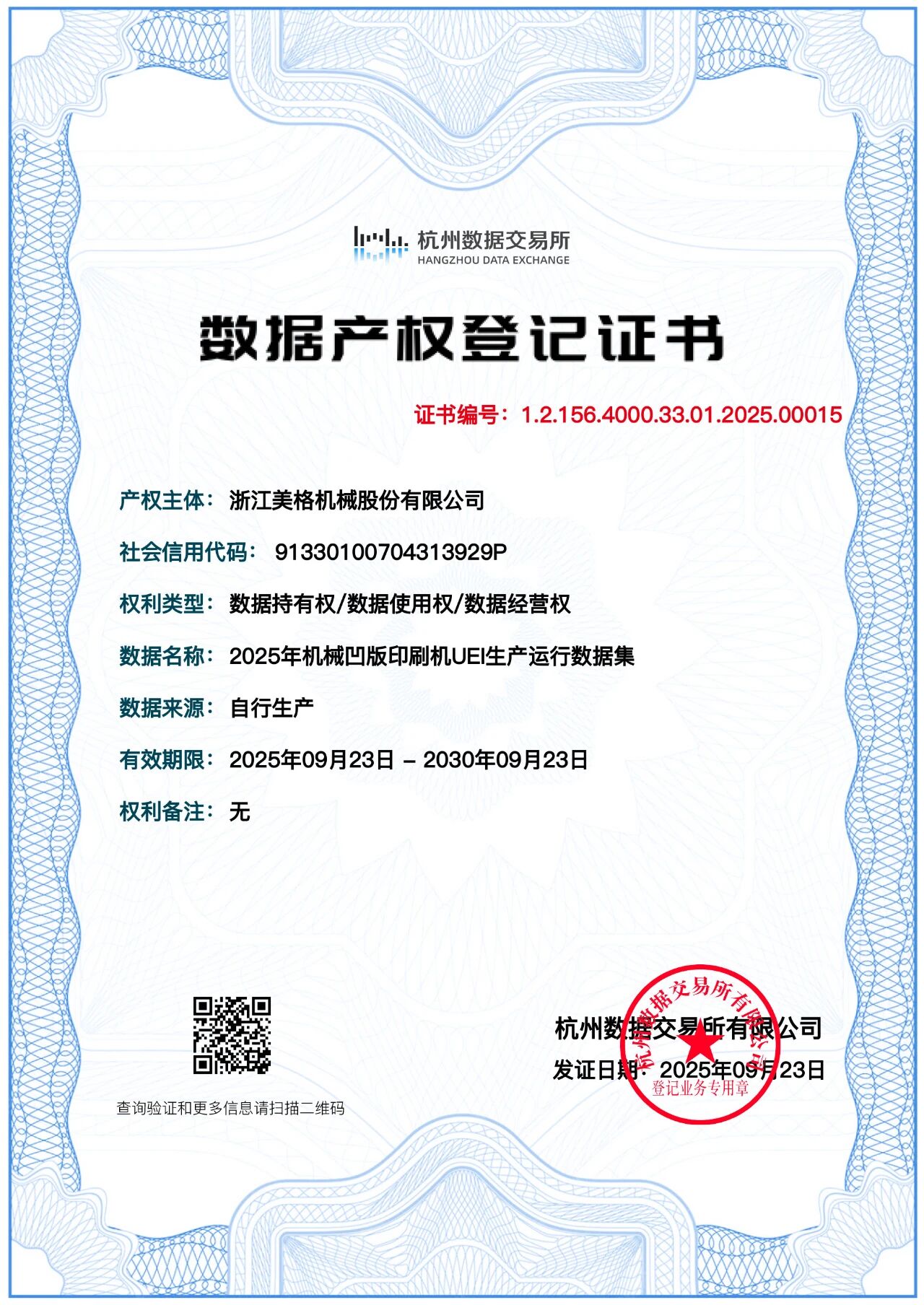 熱烈祝賀浙江美格機(jī)械股份有限公司成功取得“數(shù)據(jù)產(chǎn)權(quán)登記三證合一證書(shū)”,摸不著的數(shù)據(jù),終于有了“法定身份證”!